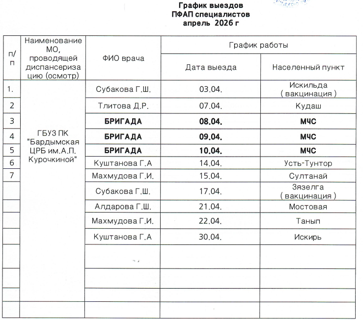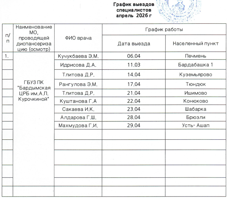 Режим работы медицинских работников ГБУЗ ПК Бардымской ЦРБ им. А.П. Курочкиной, время посещения больных